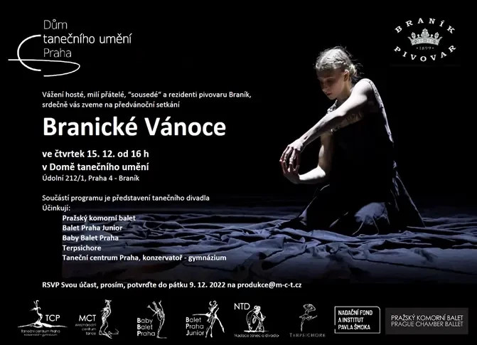 Srdečně vás zveme na Branické Vánoce – tradiční předvánoční setkání, které se každoročně koná v Domě tanečního umění v areálu bývalého Branického pivovaru. Akce je určena rezidentům pivovaru, jeho sousedům a všem příznivcům komunitního života a umění.