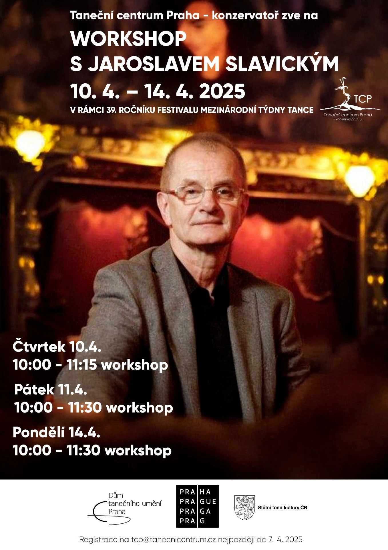 Jaroslav Slavický je zkušený pedagog a interpret současného tance, který propojuje technickou preciznost s výrazovou volností. Účastníci workshopu měli možnost rozvíjet pohybovou techniku, improvizaci a kreativní vyjádření pod vedením zkušeného profesionála.