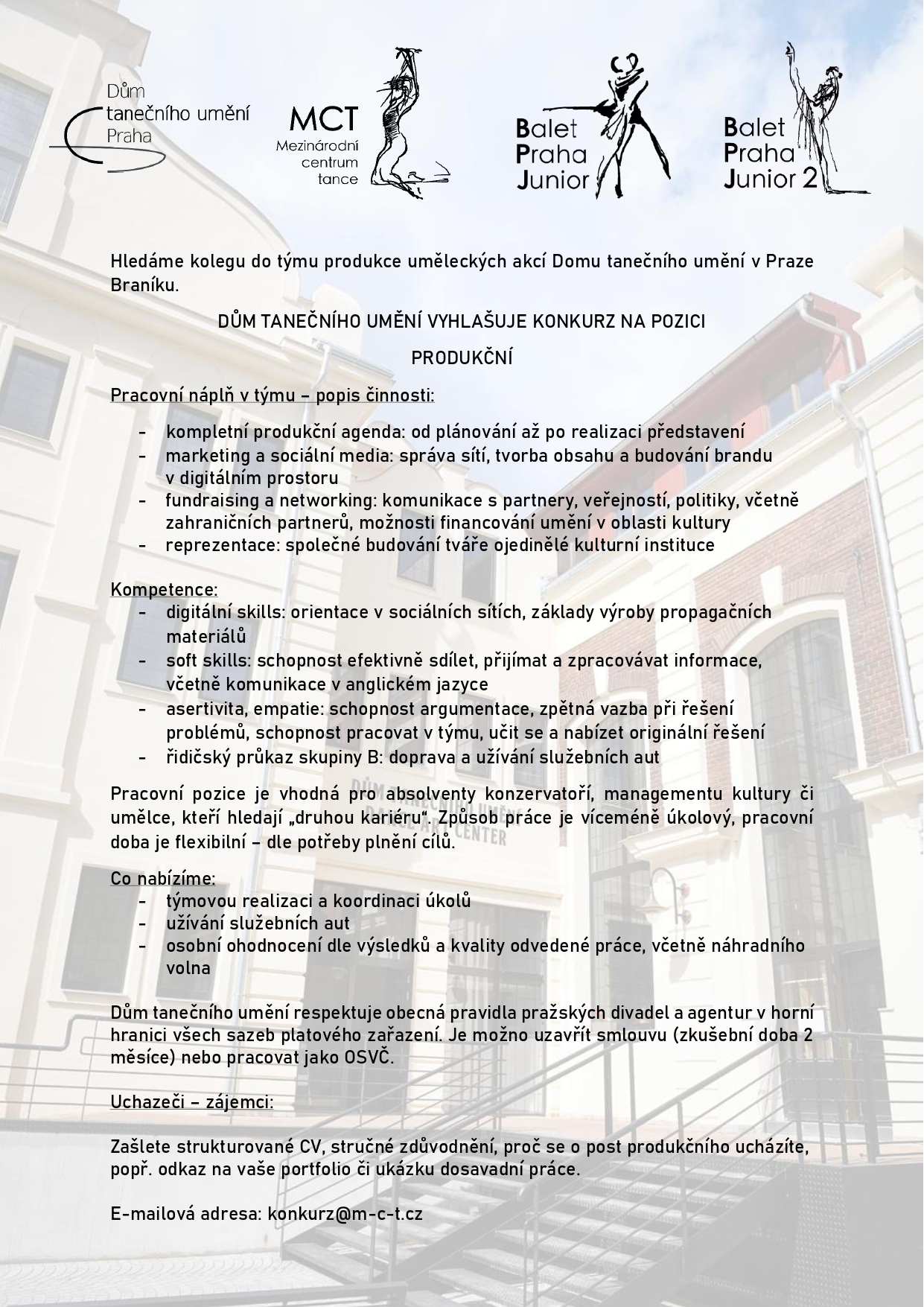 DŮM TANEČNÍHO UMĚNÍ VYHLAŠUJE KONKURZ NA POZICI